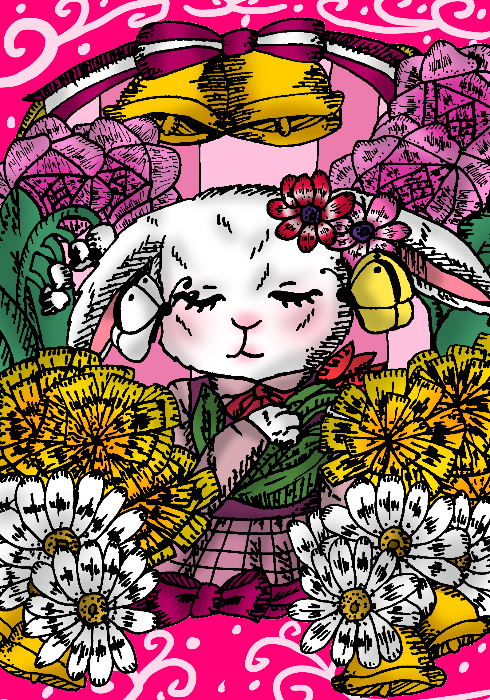 テーマが「はじまりの予感」という事だったので、私は「春」をモチーフに春に咲く色んな花に囲まれて嬉しそうな手にチューリップを持っている垂れ耳兎の女の子やリボン、額縁、予感を知らせるようなベルなどを描いてみました。それに合わせて背景も少し凝ってみましたよ~。