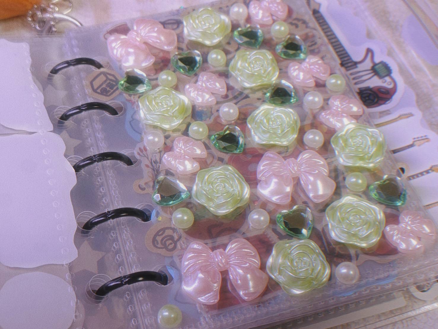 緑色の薔薇の形のシールや、緑ハートのシール、ピンクのリボンのシールを貼りました!