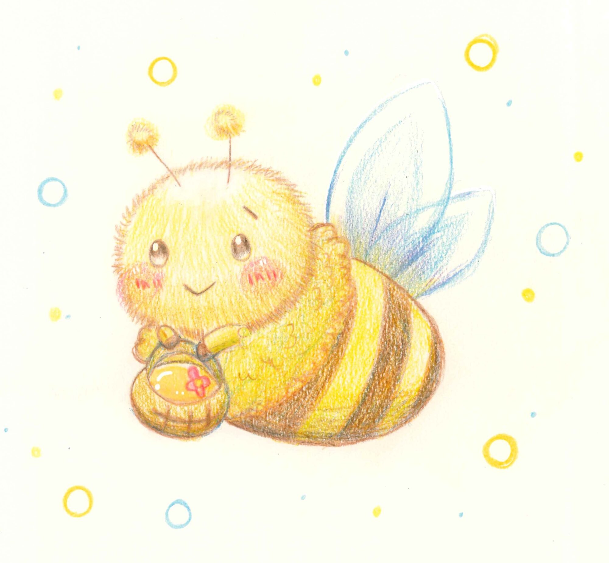 今回のイラストは、はちみつを運ぶほわほわなはちさんを描いてみました。