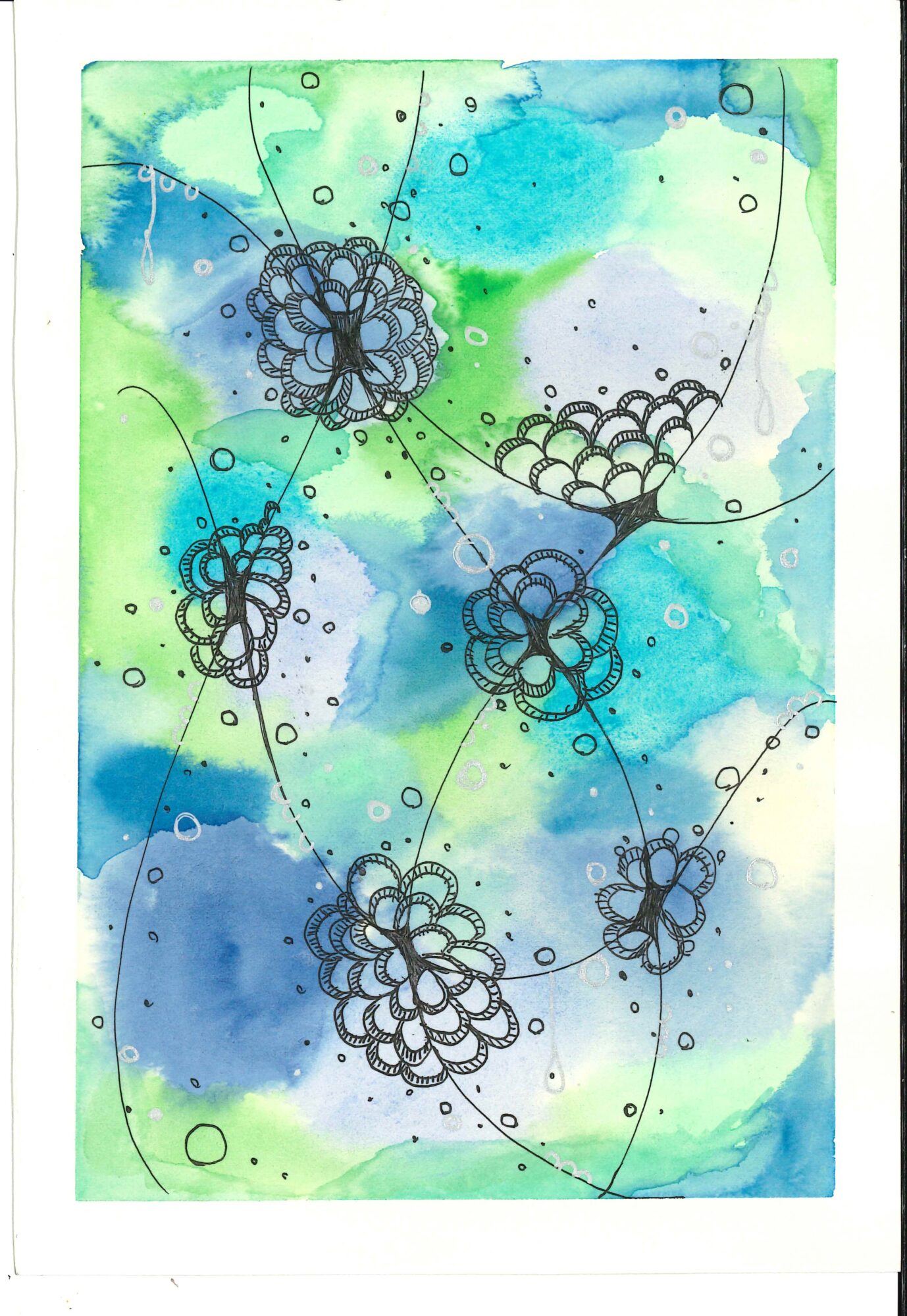 絵の具を使った後、良い感じに綺麗に絵の具同士が混ざってくれたおかげで水の中のイメージになったので、画面に描こうとした線は花とうろこをイメージして、周りのつぶは水の泡のイメージだったかと思います。