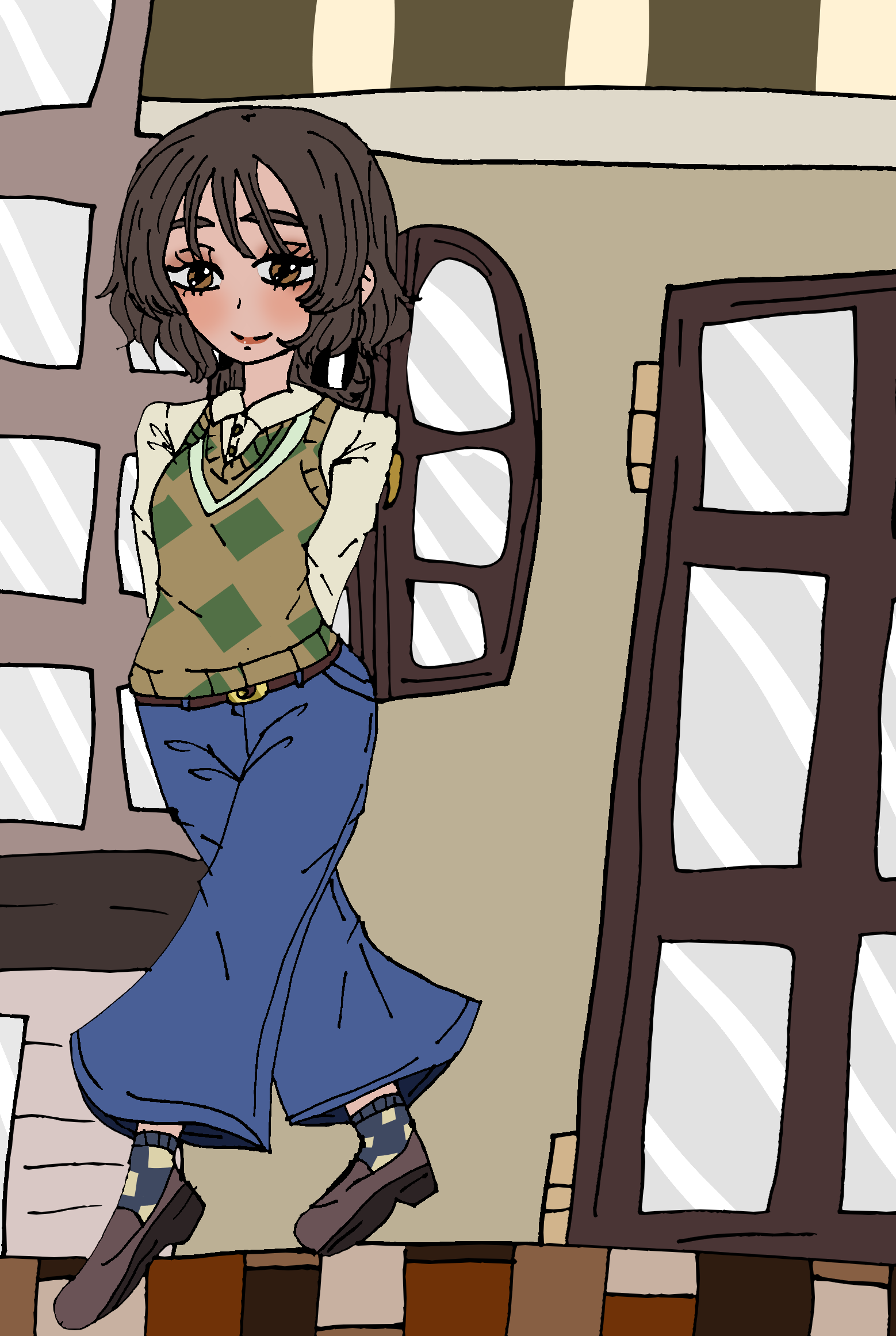 街中の色んな所を散歩しているオシャレな女性を描いてみました。いつか私もカフェ巡りとかしてみたいな~。