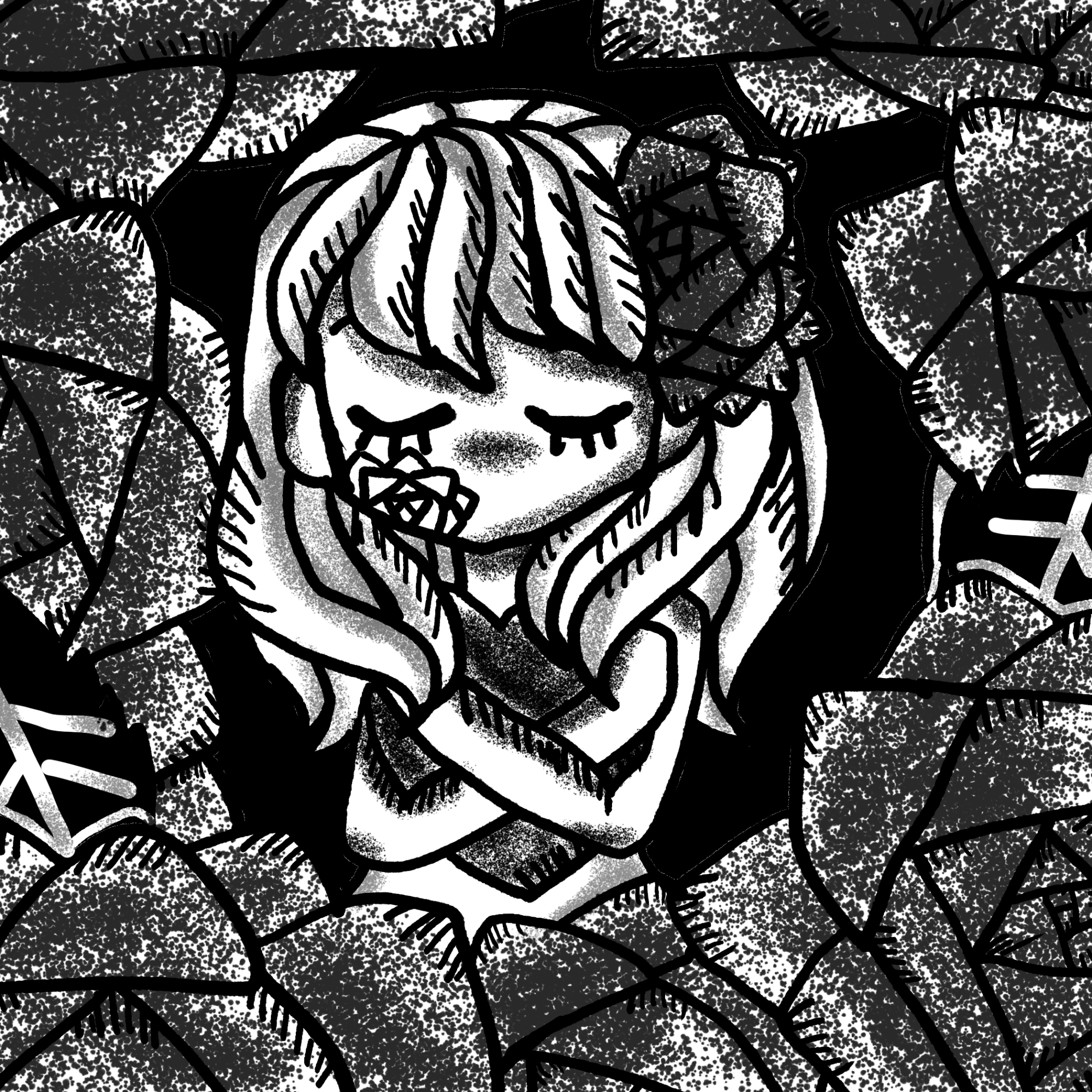 黒い薔薇の花言葉「永遠の愛」をモチーフに、ハートを抱きしめている女性を点描画風に描いてみました。
