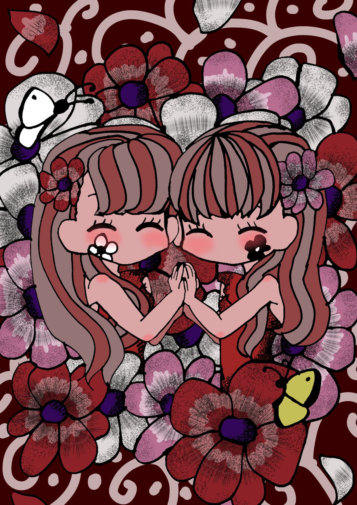 アネモネの花言葉モチーフに仲良しな双子の女性を描いてみました。