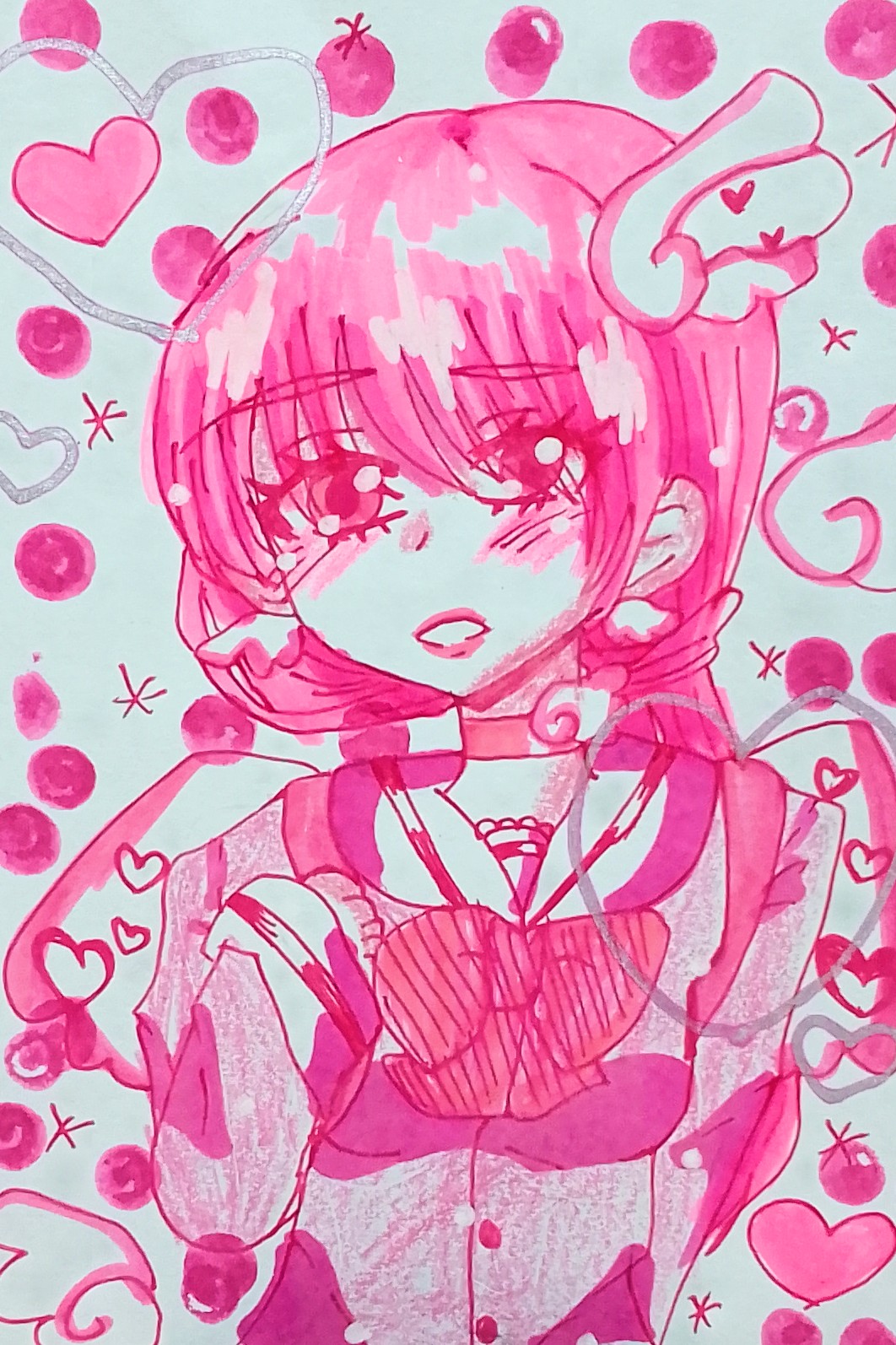 天使の羽のリュックを背負っている可愛い服装の少女を描いてみました。ピンク縛りで描くのもいいですね!