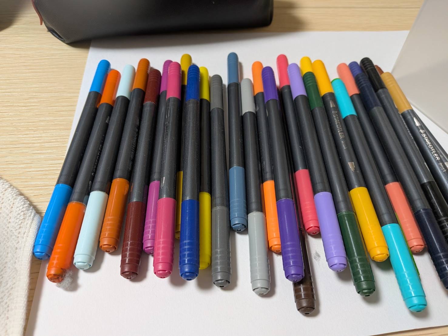 このペンは水彩にも使えるペンで、太い芯や細い芯がついています!また、いろいろな色のペンがあるので組み合わせには困らないと思います!