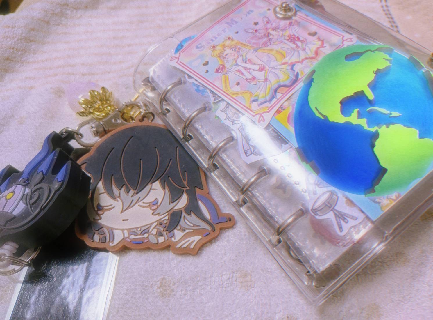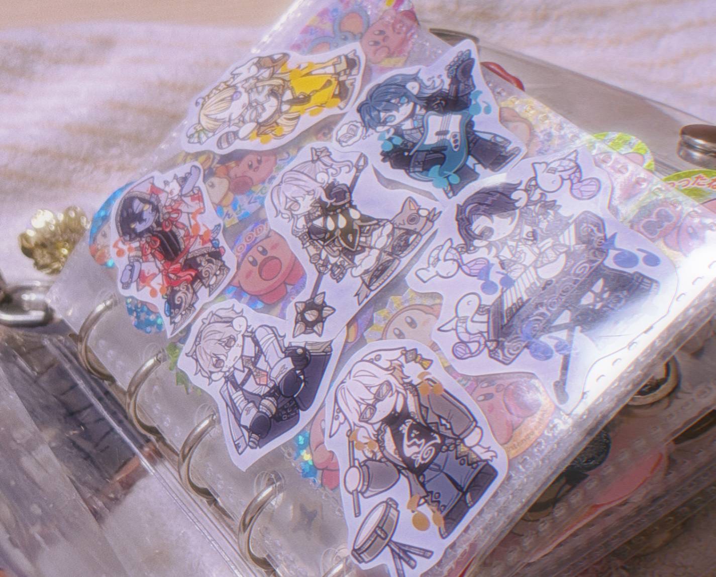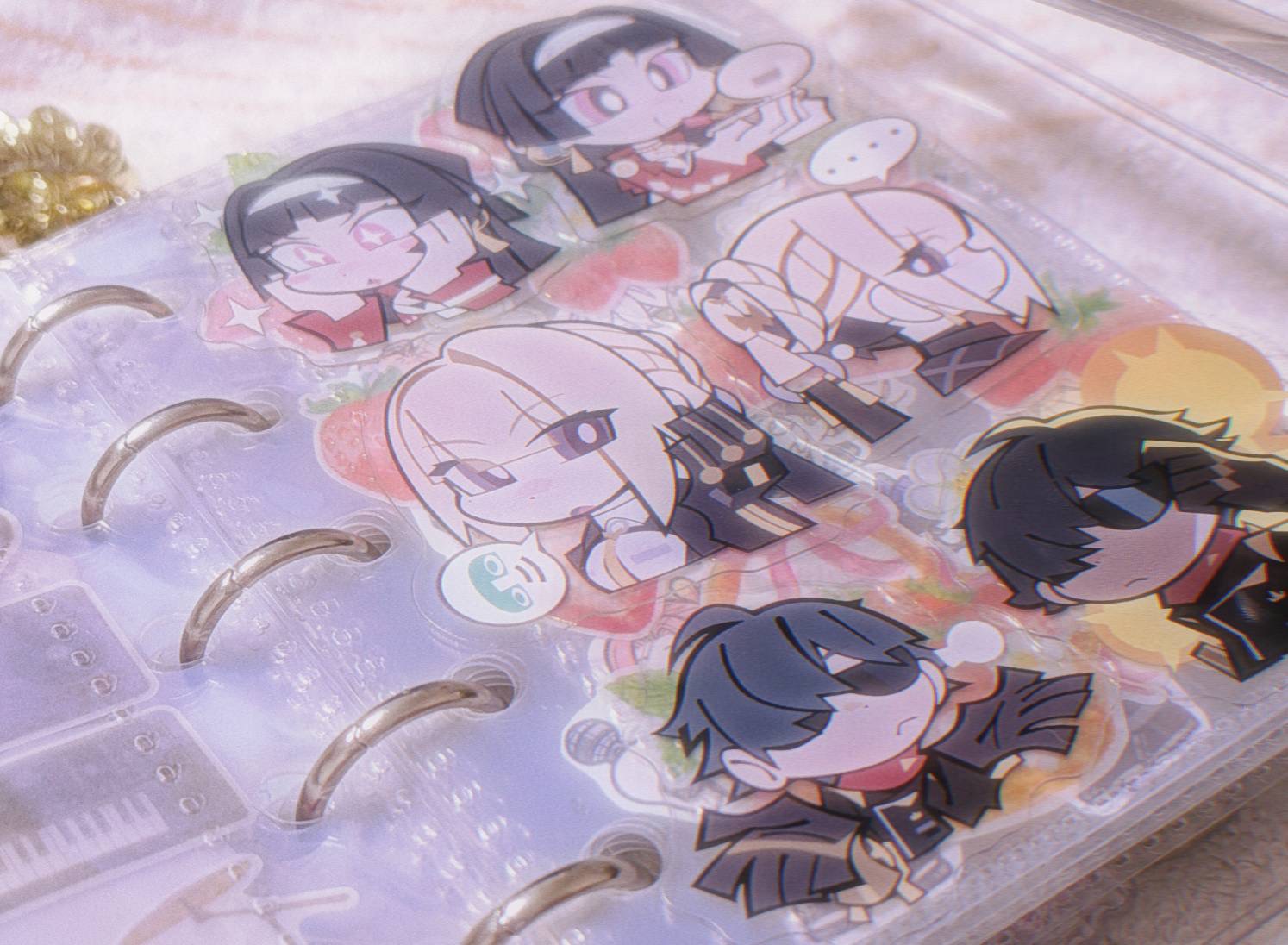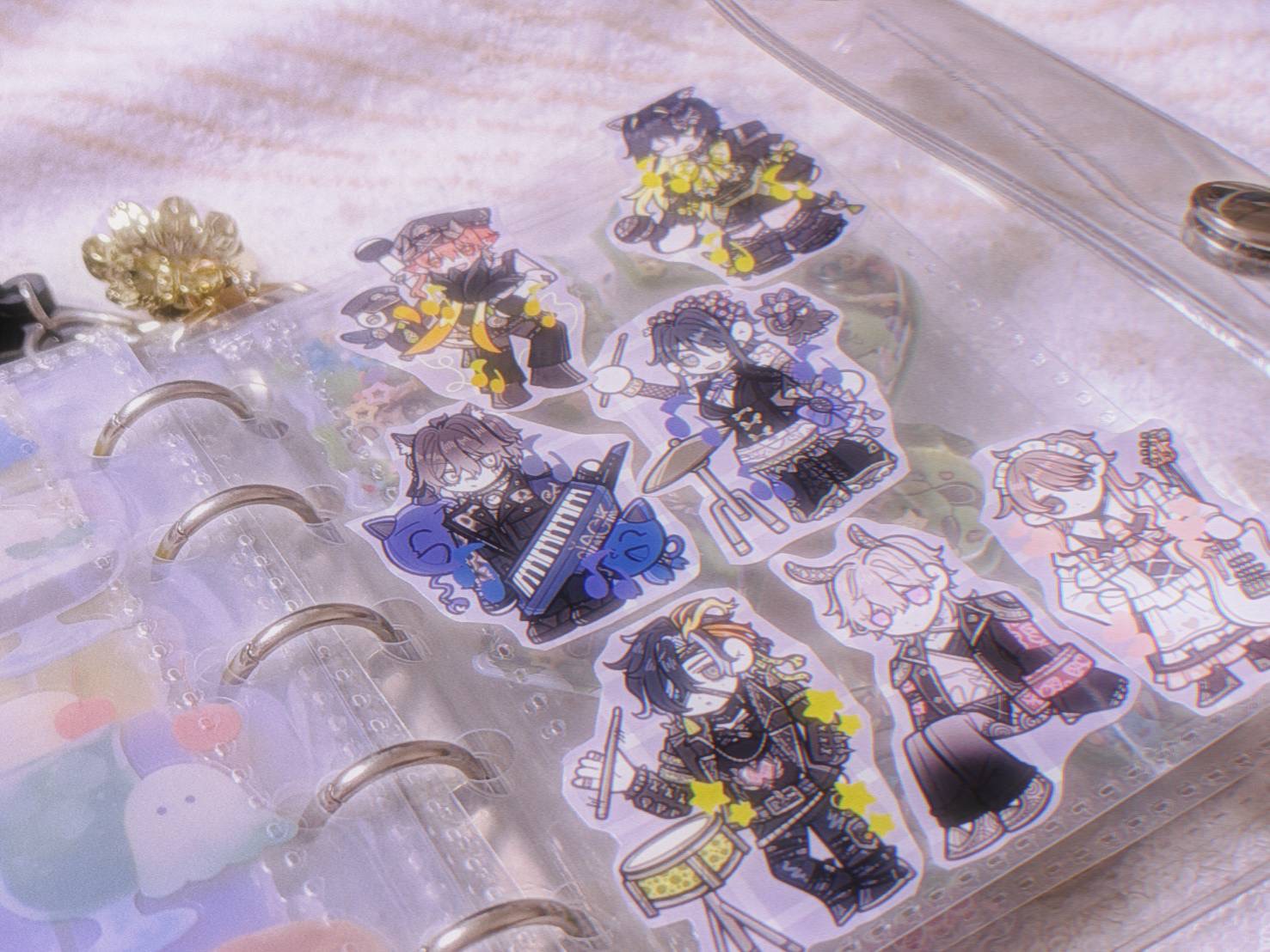 ちなみにシール帳のホルダー穴に繋いでいるキーホルダーは「ポケモン」の「シャンデラ」というキャラクターと「刀剣乱舞」というゲームのキャラクター「数珠丸恒次」と百均で買った白いちごのキーホルダーです!