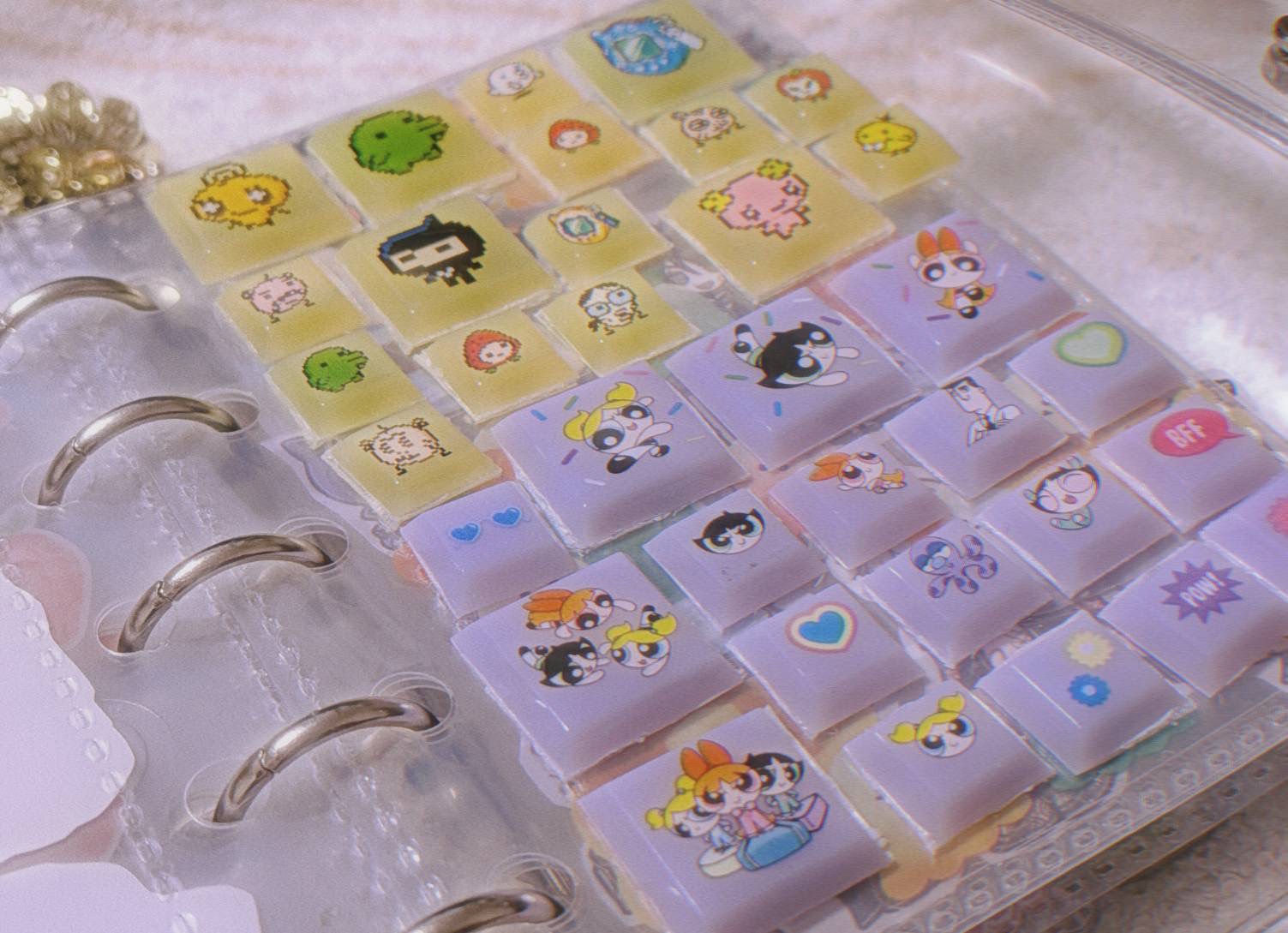 まず黄色のタイルシール(上部分)は「たまごっち」というゲームのキャラクターシールです!平成に流行ったゲームですよね〜(私はやってないです)