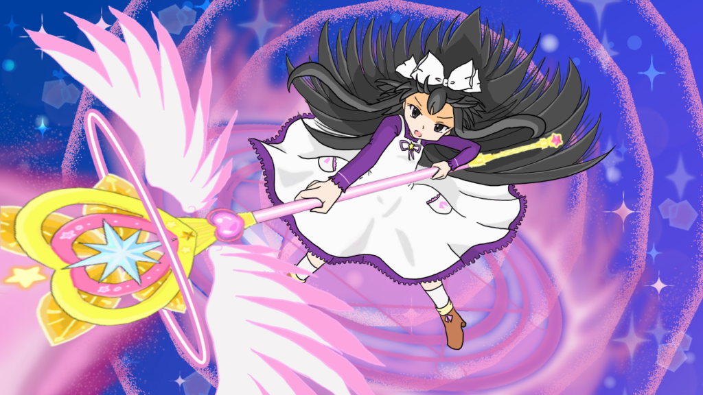 ついでに髪の毛ブワーって、はためいている(?)表現にも挑戦しましたが…やはり髪の毛が細かくないと難しいですね。光加減も試行錯誤した挙句、一瞬ボツにしようか悩みました。魔法光は色々なペンのおかげで結構良くできたとは思うのですが…うーん。