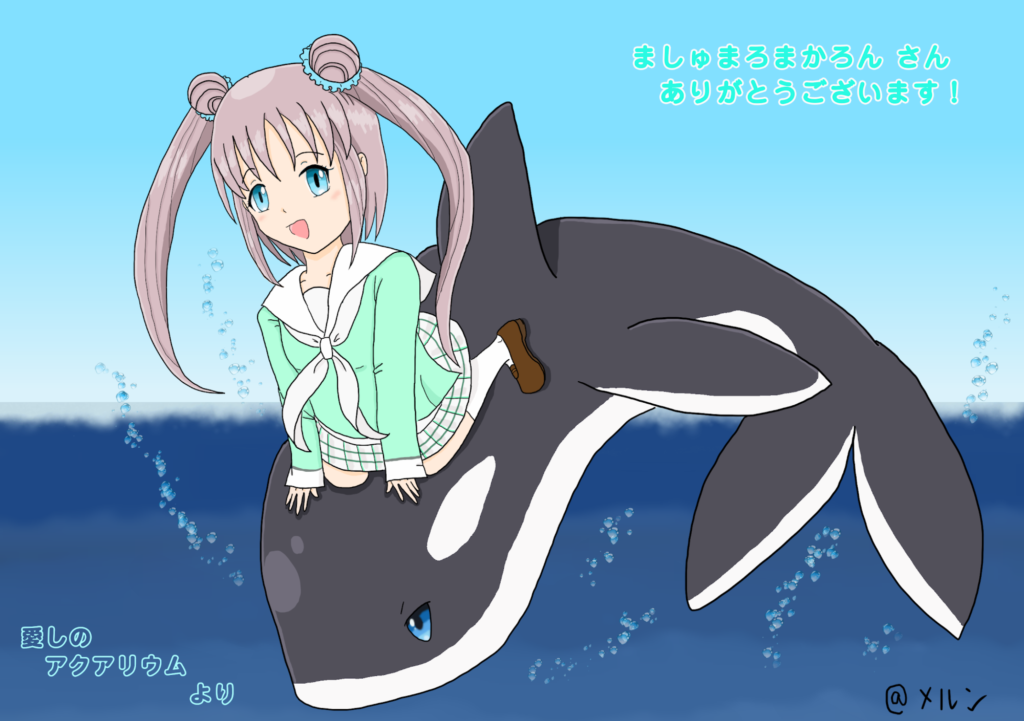 「愛しのアクアリウム」から主人公の茉莉華ちゃんとシャチのノエル君(シャチの姿)。