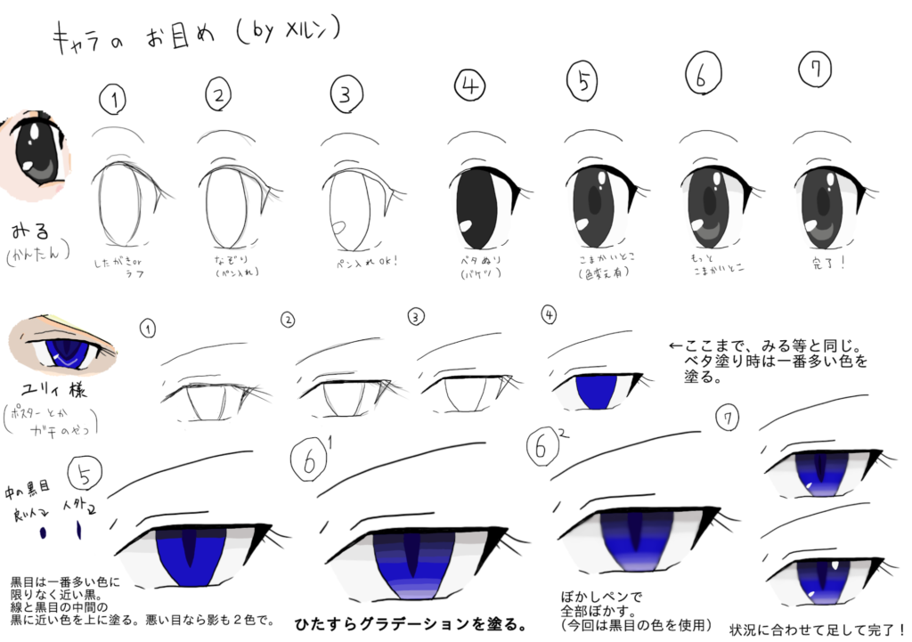 前は例にしているユリィ様の目の描き方をしていましたが、最近色々描くうちにこうなりました。白い光(ハイライト?)と中の黒目の色と形も、キャラによって(あるいは状態によって)分けています。(⑥ー2で止めると邪悪感や精神支配系っぽい目になる。)