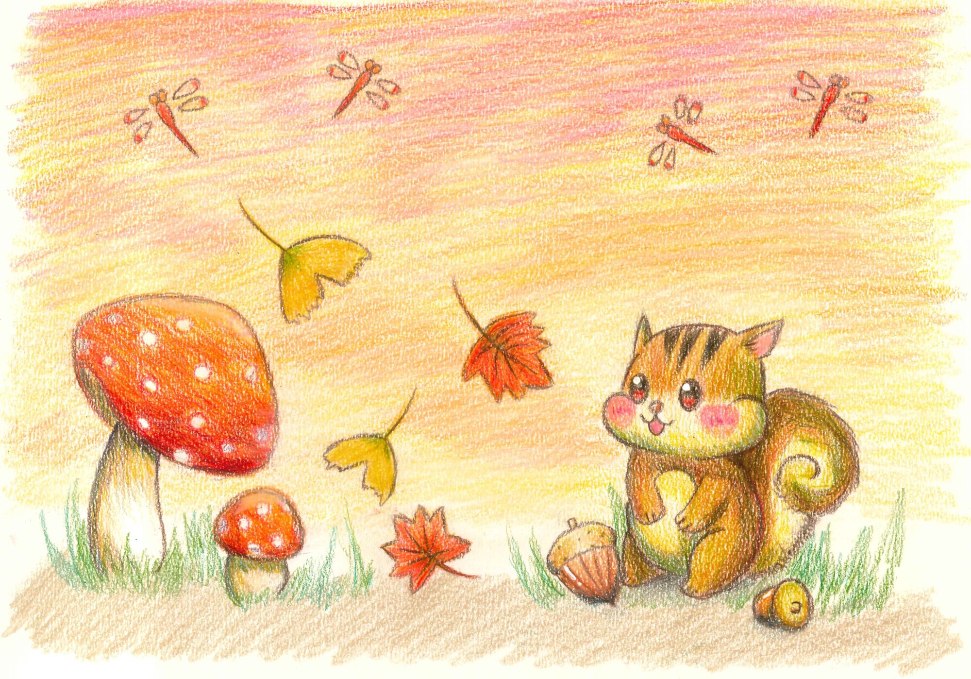 りすちゃんにきのこ、落ち葉に赤とんぼ…秋を連想させるものたちを描きつつ、空は夕暮れにしてより秋の空気を感じられる一枚になれていたらと思います。