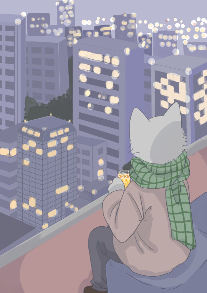 今回は、室内の展望台から夜景を眺める猫のイラストを描きました。