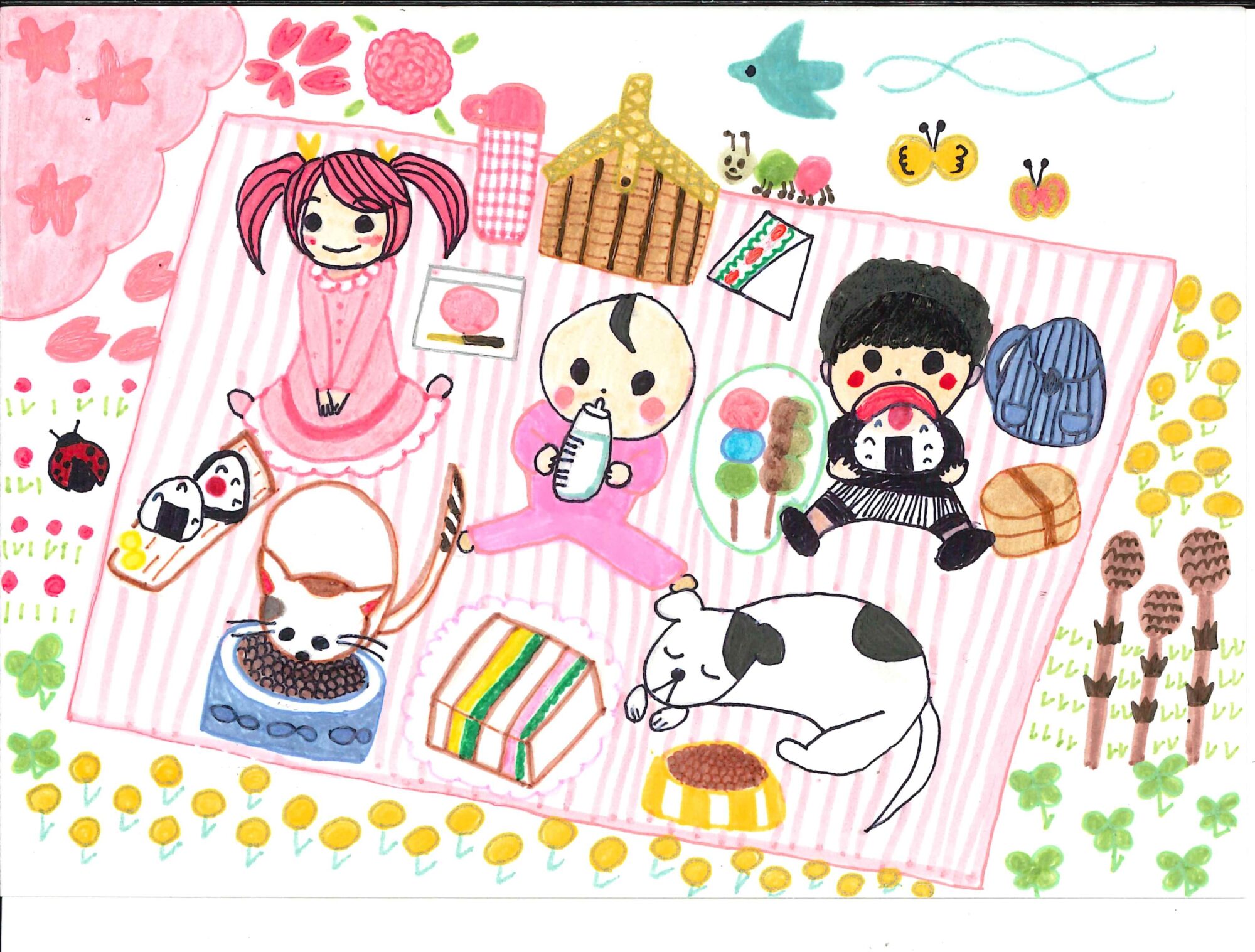 「桜の木の下で、ママと赤ちゃんにワンちゃんとにゃんこが楽しそうに