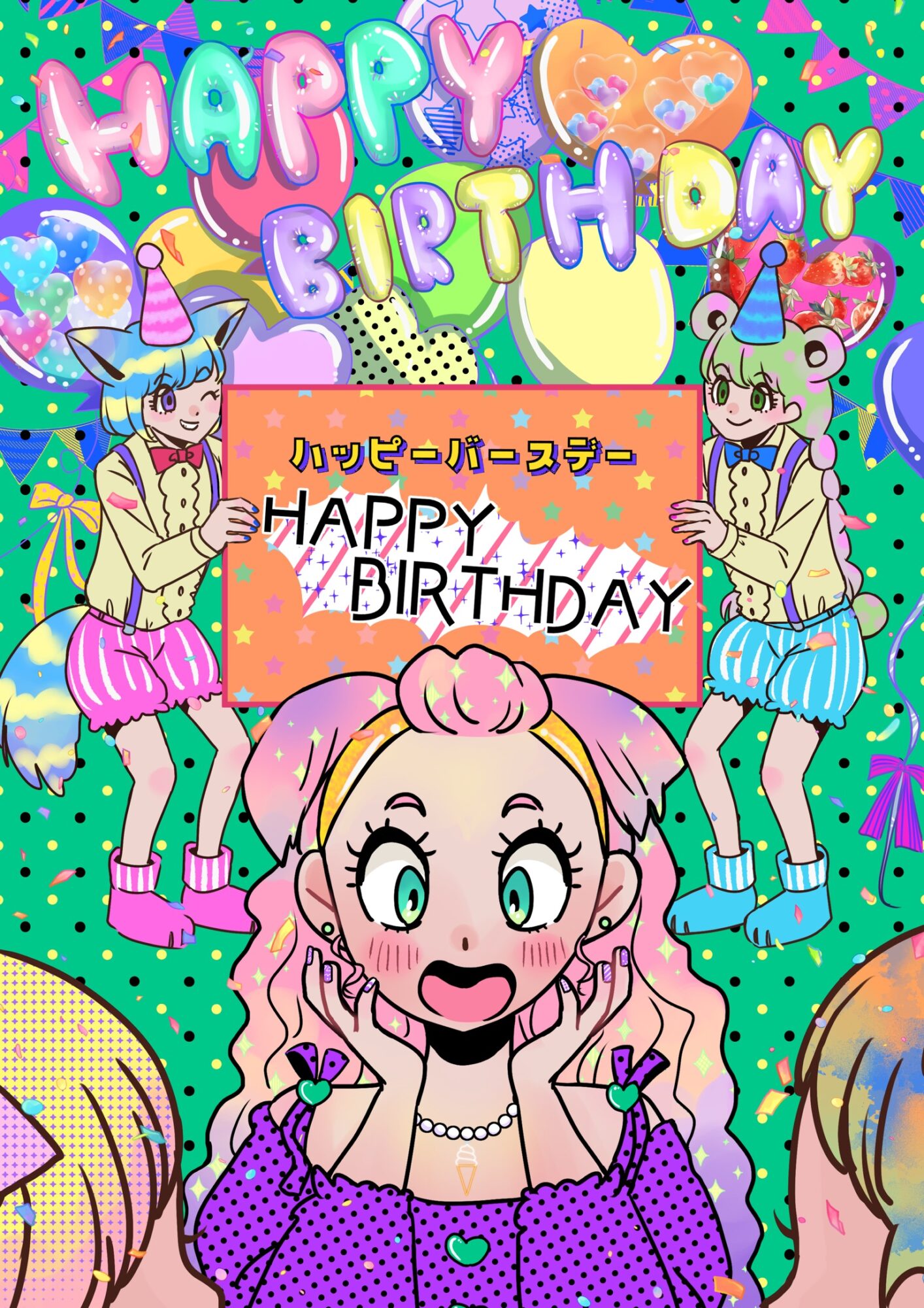 誕生日の楽しい雰囲気をイラストにしたいと思い制作しました。ビビッドなカラーを使うことで、ポップな感じが出て誕生日のサプライズ感が表現できたように思います。全体がカラフルになった分、背景色選びはとても迷いましたが最終的に選んだグリーンがよりキャラクターを可愛く引き立ててくれたので良かったです。
