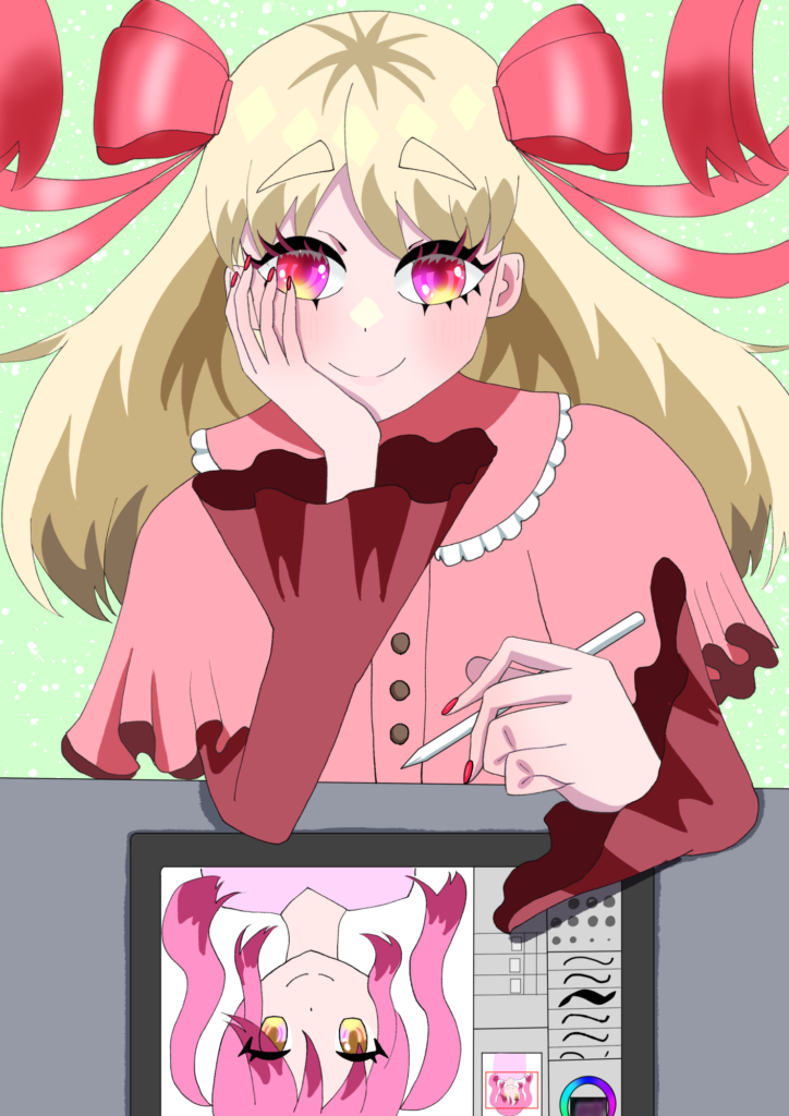 また可愛い女の子が好きなので、可愛さの象徴としてピンク中心の配色にしてフリルもたくさん盛り込んでみました。リボンを描くのも好きなので描きました。