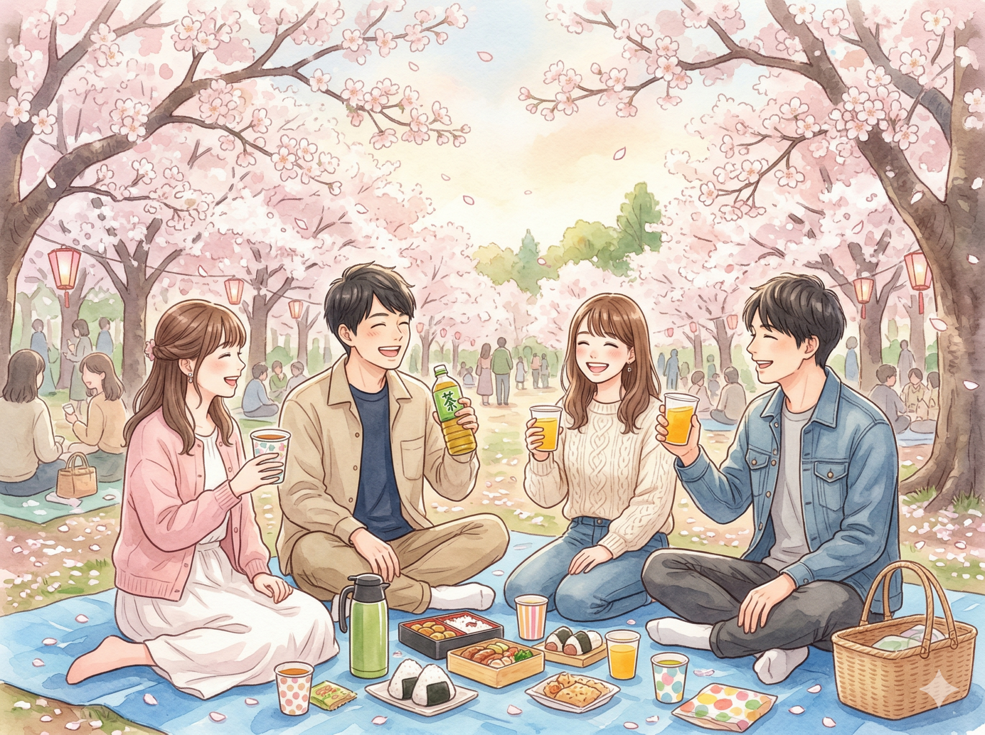 お花見の楽しげな明るい雰囲気が出るようプロンプトを調整しました。お酒にならないよう気を付けています。柔らかなタッチに仕上がりました。