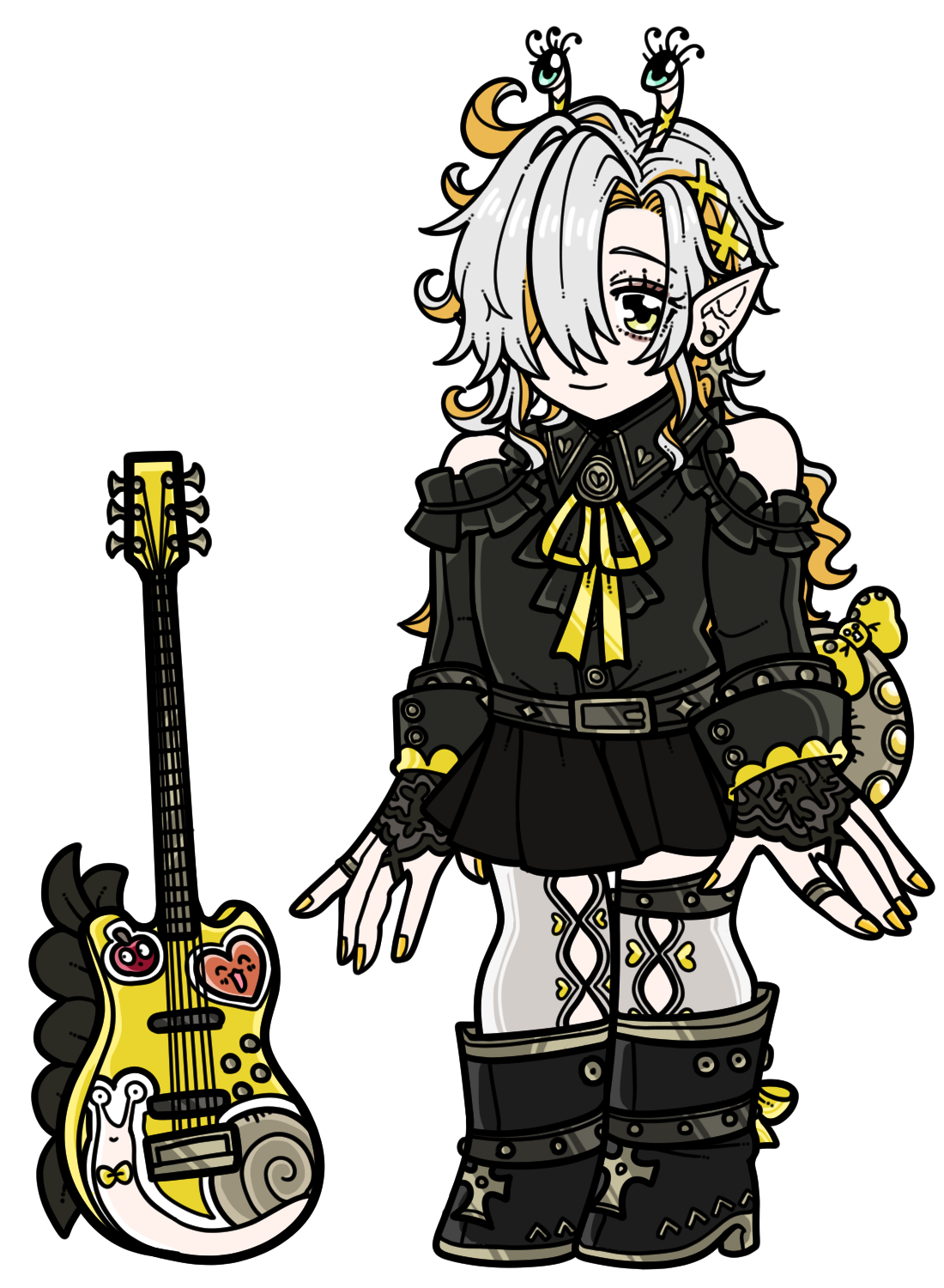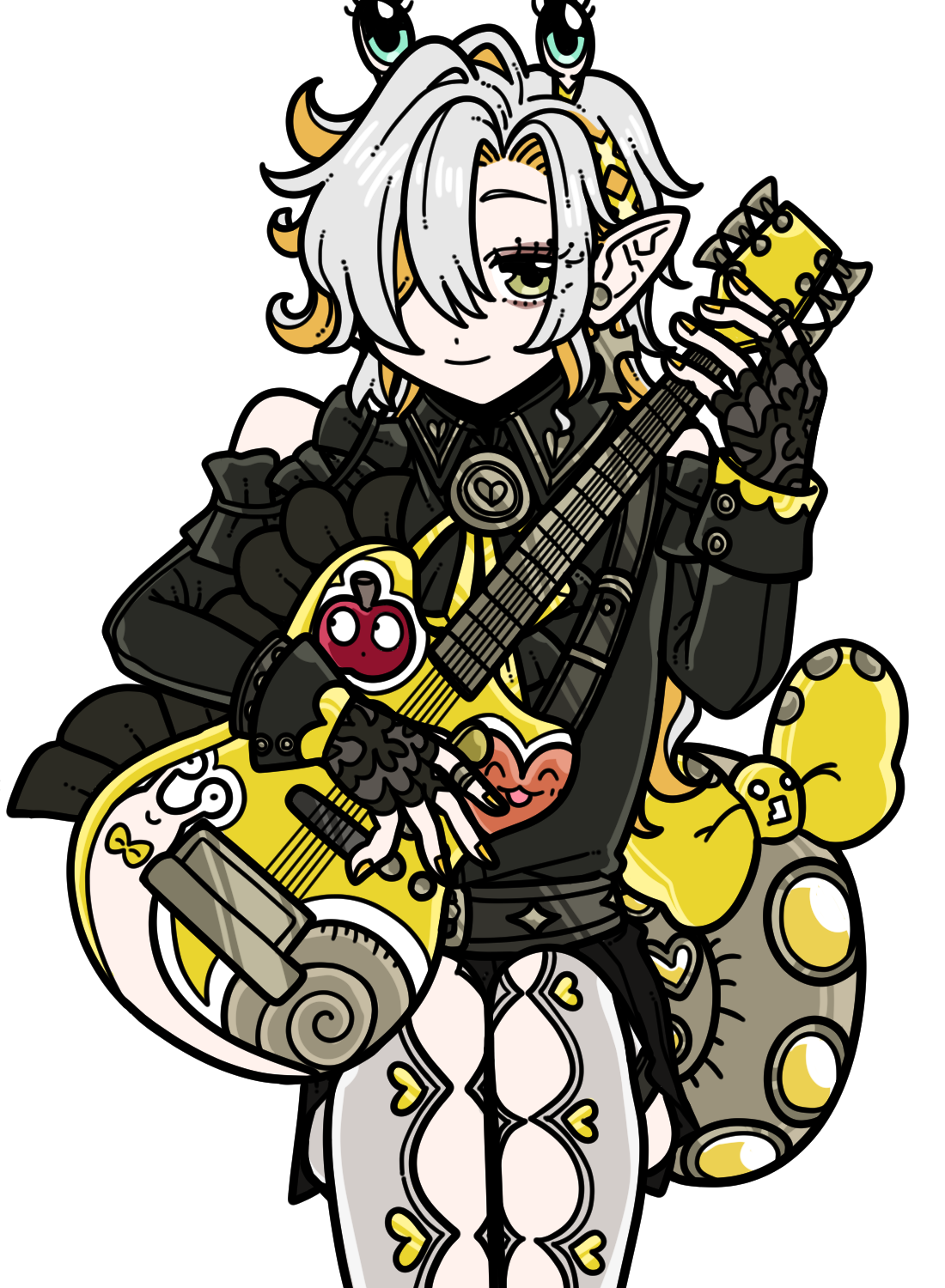 可愛らしい見た目のキャラクターですね〜!可愛らしいギターも持っていますが、、、。頭に生えている目?らしきものも気になりますね、、、。