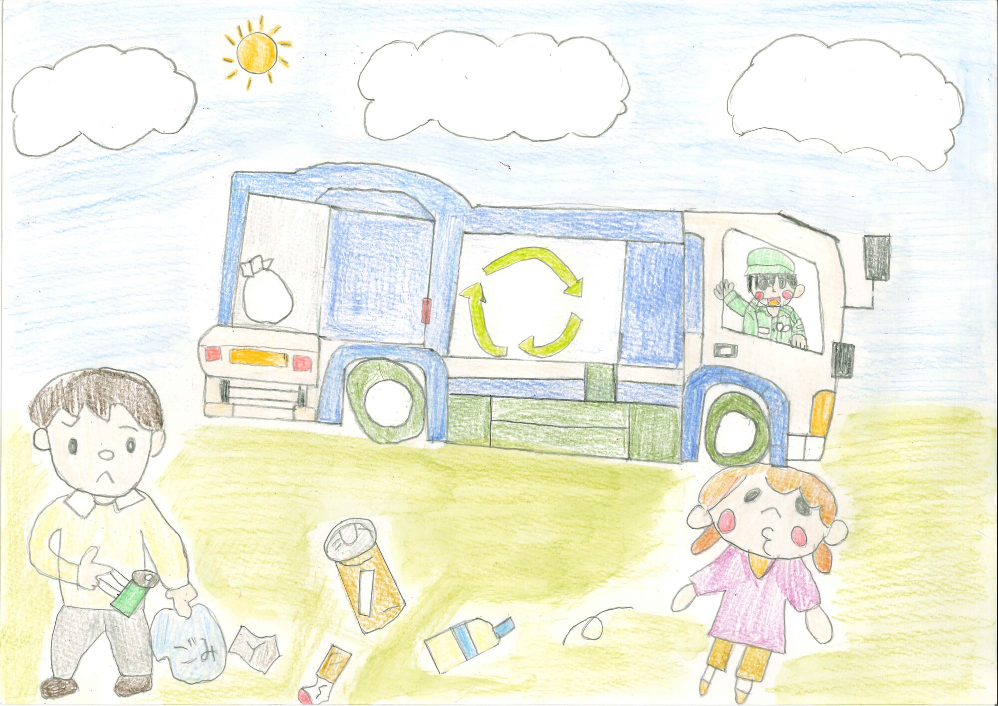 全体としてごみを回収する仕事の一場面として描いています。