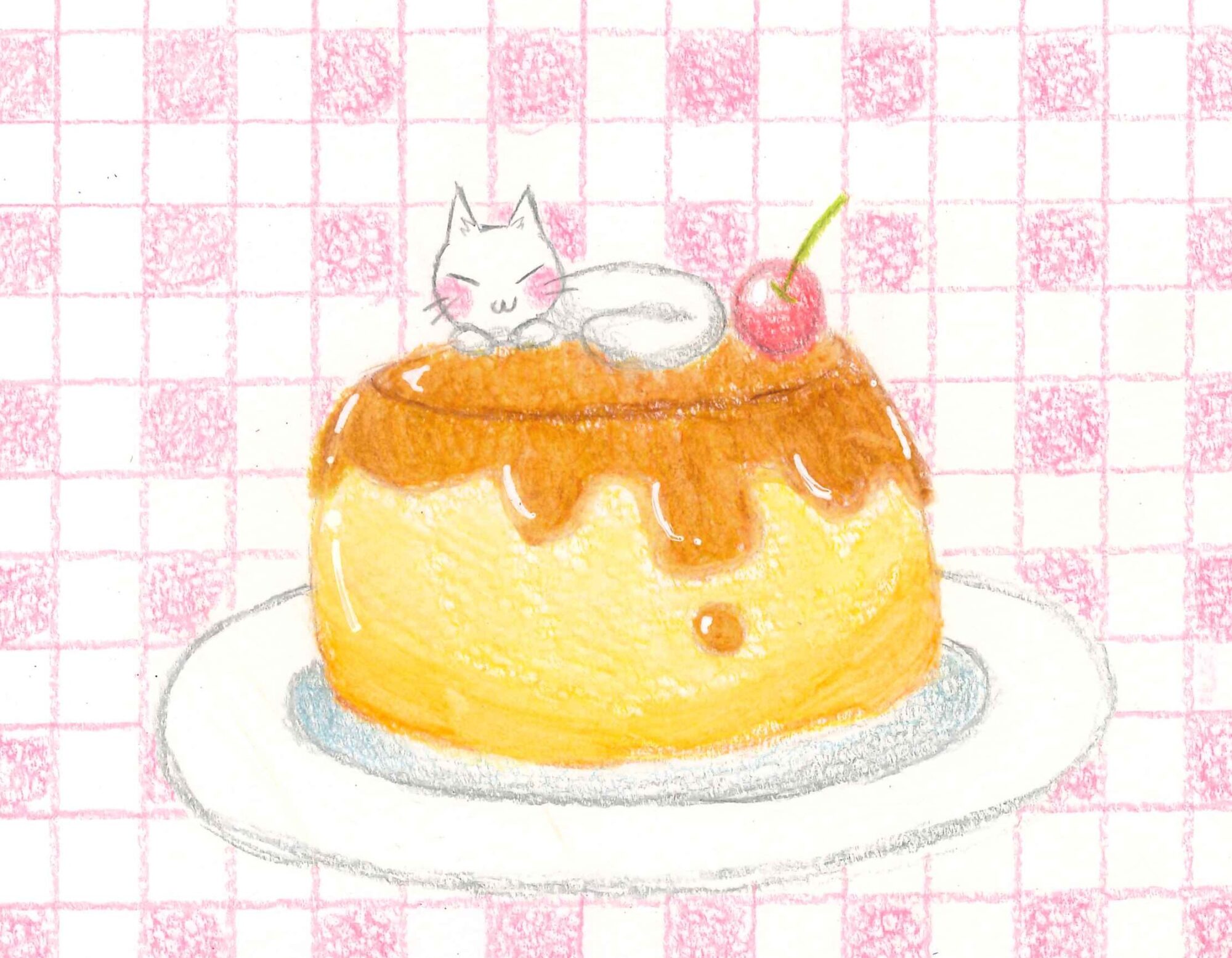 今回はプリンの上でお昼寝をするねこちゃんを描いてみました。
