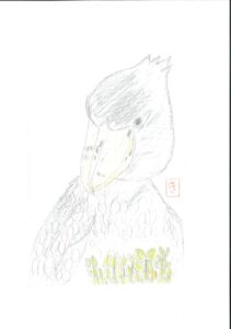 ハシビロコウさんに会いに行けないため、インスタグラムで写真をみて、千葉市にある千葉市動物公園でスケッチした気持ちで描いてみました。