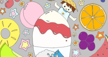 夏の果物と、練乳のかかったイチゴのかき氷を食べる女の子のイラストです。 果物のトロピカルな感じを出せるよ...