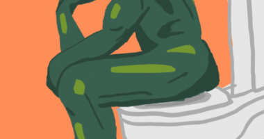 作品についてタイトル「出ない」考える人をモデルにアイデアが出ないのとトイレが出ないのを掛け合わせてみました。あえて線画...