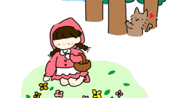 おとぎ話の「あかずきん」を題材にした作品です。 赤ずきんがおばあちゃんの家に向かう途中で、お花摘みをしていますね...