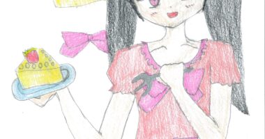 スイーツをテーマにスイーツを料理して食べようとしている女の子を描きました。髪の毛は少女らしい黒髪にして、エプロ...