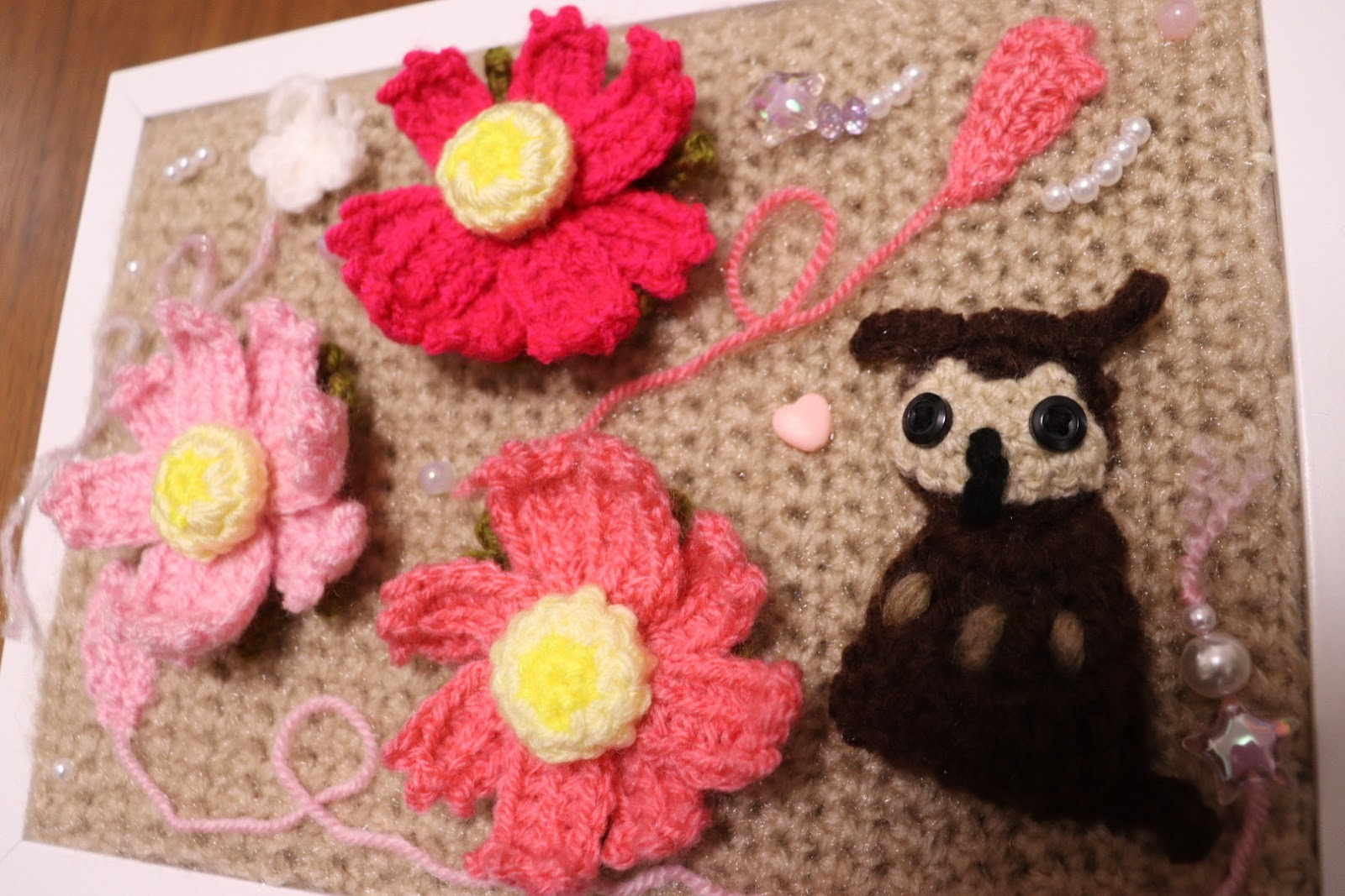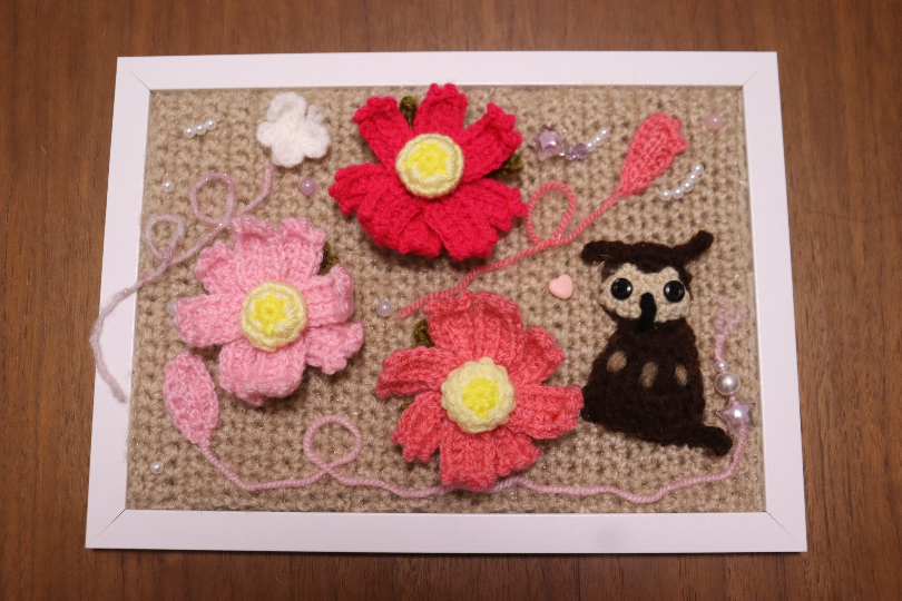 また、コスモスは可愛らしい色の毛糸を3色入手できたのでそれを使い編んでみました。花びらを綺麗な形に編むことが難しかったです。