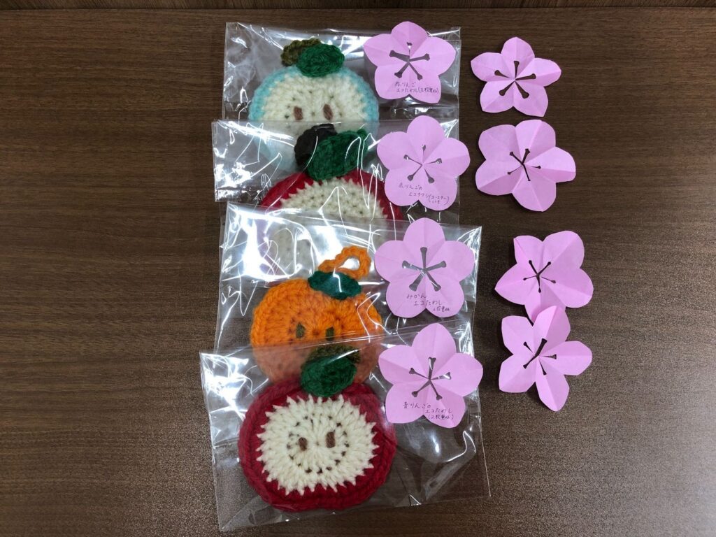 委託販売の編み物のPOPに、折り紙で花桃を作ってみました。