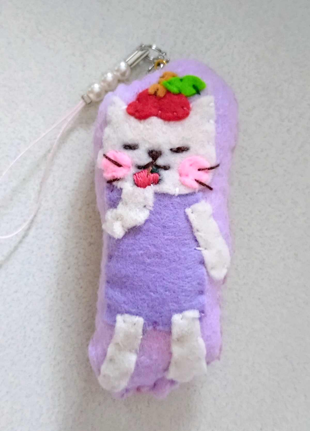 猫がリンゴを味わって食べている所とリンゴの帽子をかぶっている所がポイントです。