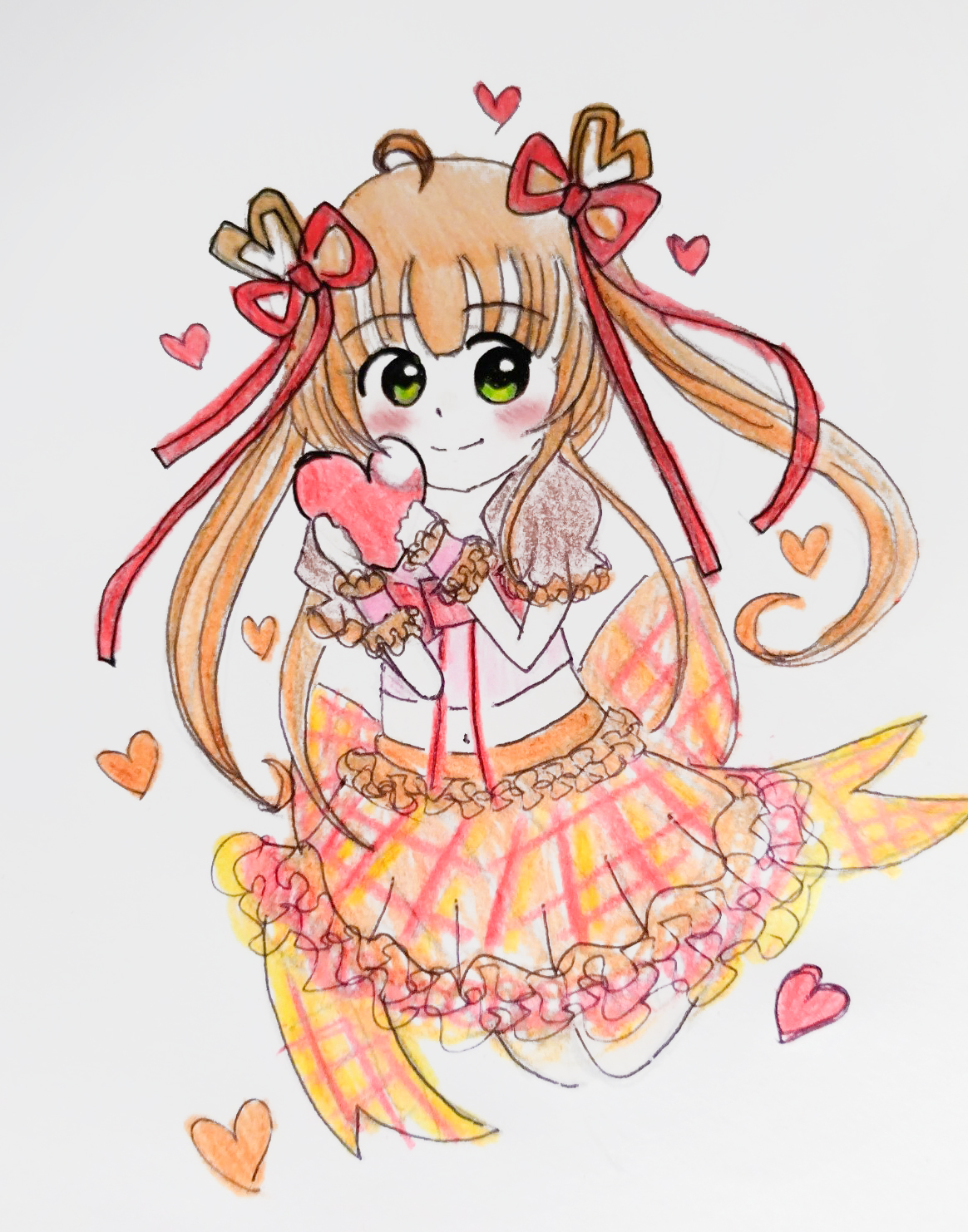 リボンや髪型がハートになっていたりチョコレート色を意識しながら色を塗りました。