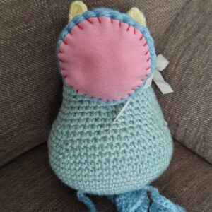 胴にくっつけます。3分の1ほど宙に浮かせる形にして、その下を黄色い毛糸で縫い付けます。