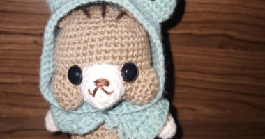 カエルのフードを被ったリスのあみぐるみ