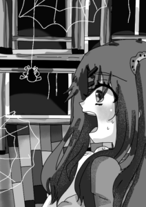 「証拠になるものはっと・・・・・・・、っ⁉きゃあぁぁぁっ!く、く、蜘蛛がいる~!!」奈々は証拠になるものを探している途中、埃まみれの机の下から大きい蜘蛛が現れ腰を抜かして悲鳴を上げて驚いていた。