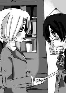 「ようこそ探偵部へ。実はね、僕は探偵部の部長なのさ!隣にいる子は副部長の道坂佐奈先輩。」と部長である斗真は、副部長の佐奈という女の子を紹介した。佐奈は眼鏡をかけたおっとり少女で、探偵ものの小説が大好きな女の子だった。佐奈の机の周りには、大好きな小説が2,3冊置いてある。