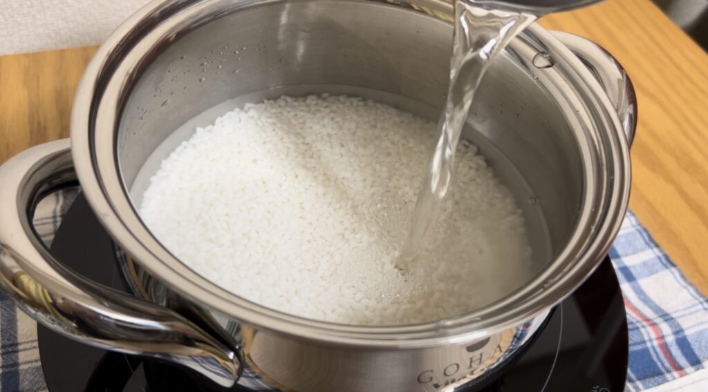 写真では炊飯専用鍋を使っていますが、ふたがある鍋なら片手鍋などでも大丈夫です。