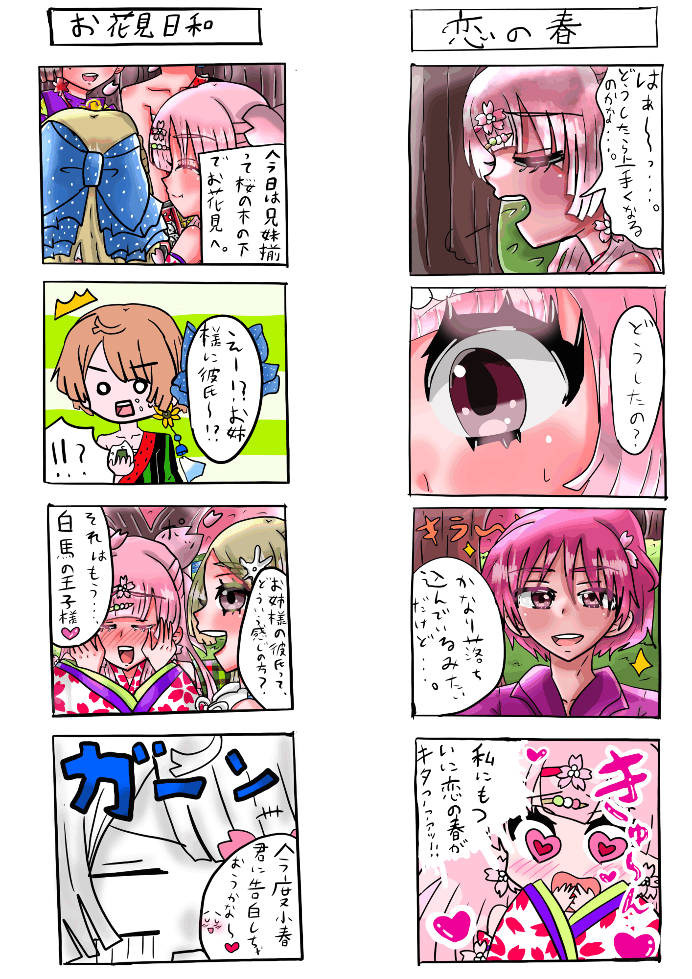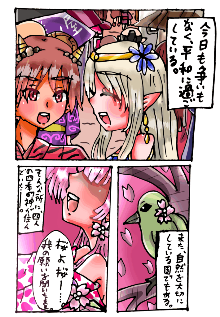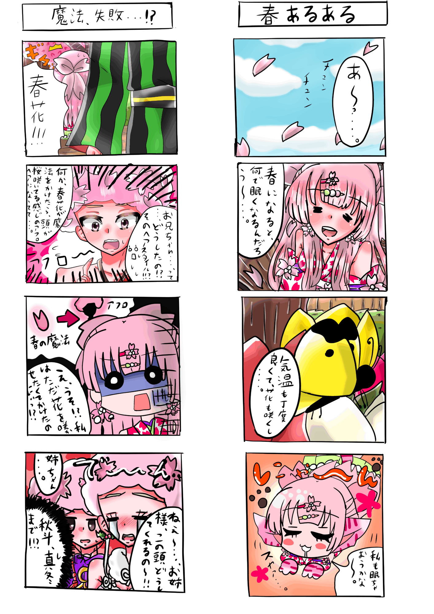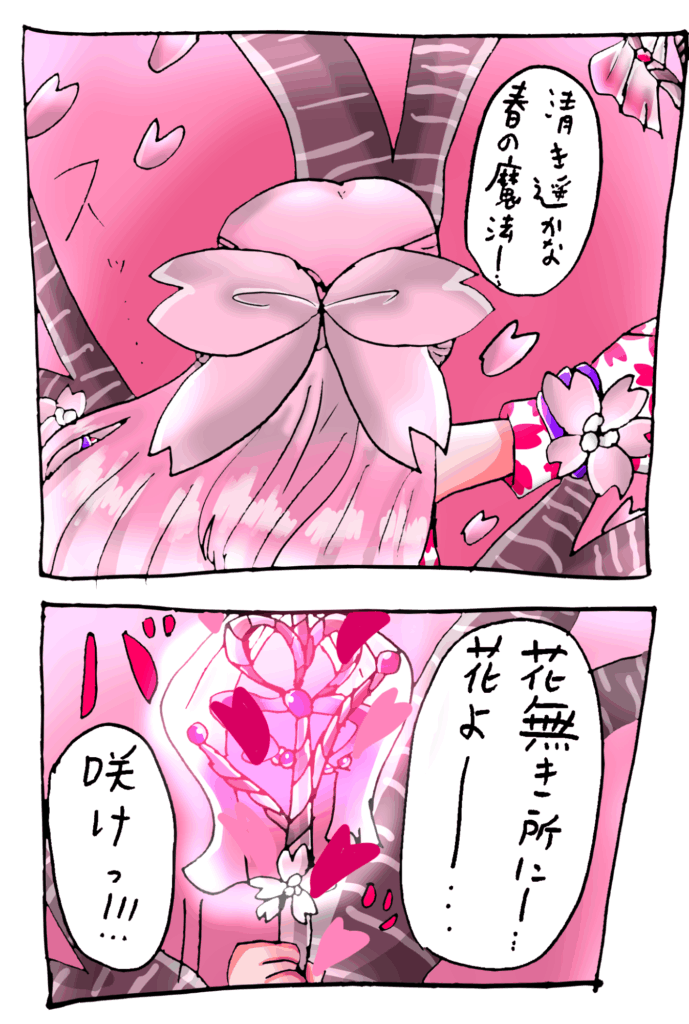 と1話はこんな感じです!自分の魔法の失敗で兄や弟、妹を桜満開アフロにしてしまい、自分の実力にショックを受けた春花。桜の木の下で落ち込んでいると、小春という爽やかで優しげな青年に会い恋に落ちた春花。花見の時に真冬に話をすると、横から盗み聞きしていた兄の夏樹がショックを受けて・・・・⁉