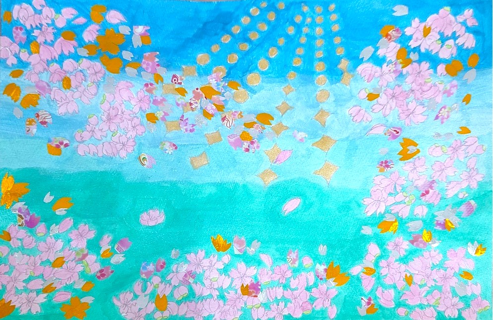 二回目の作品は桜を書いてみました。折り紙を貼ったりもしました。