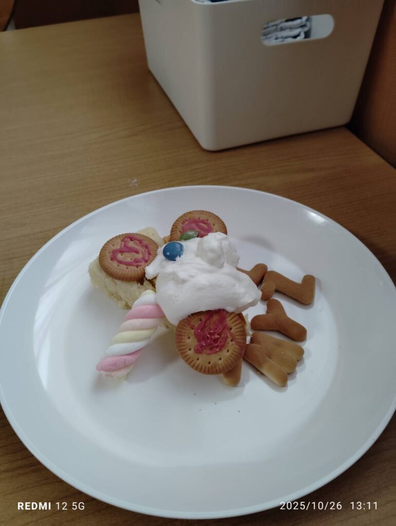 次の日10月26日この日は急遽グループホームでもハロウィンイベントをしました。この日は朝から皆で仮装して、僕は職員さんになんと!ハロウィンケーキ作りのお手伝い係に起用してもらって一緒にケーキ作りをしました。お手伝いしたのはホットケーキミックス粉を使い生地作りしたのと、ホイップクリーム作りの泡立てをちょっとと、最後のデコレーションを担当しました。最後のデコレーションはホットケーキミックス粉で作ったスポンジケーキの上にたっぷりホイップクリームを乗せて、マーブルチョコを散らして、カラフルマシュマロを乗せて、チョコペンでアイシングしたクッキーとアルファベットクッキーを乗せて仕上げました。こんな感じで仕上がりました。