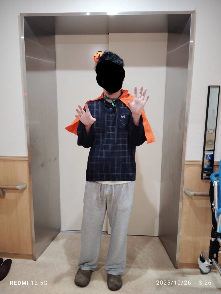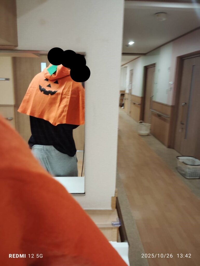 仮装はオレンジのマントにお化けカボチャが乗ったオレンジのカチューシャを付けシンプルにしました。とても楽しかったです。グループホームハロウィンそんな感じでした。