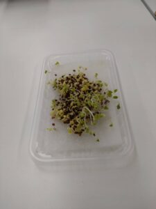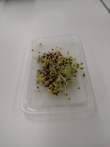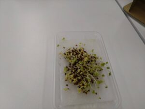 5~6㎝程に伸びてたら、日当たりのよい窓際などに置き、日光を当ててください。1~2日で葉が緑色に変わります。1週間から10日ほどで収穫です。