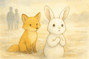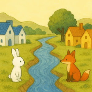 むかしむかし、白いうさぎのすむ『しろの村』と、黄色いきつねのすむ『きいろの村』がありました。