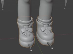 TABキーで編集モード、数字の3で面を選択できるモードにしたら、削除したい一部を選択し、Cntlと+を同時に押して、範囲を拡大していきます。消したい部分が全部選択出来たら、デリートで削除。靴の部分はカボチャを消すとリボンの中心部分が消えてしまうので、カボチャを変形してリボンの中心の形になるように調整します。