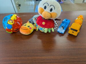 真ん中のアンパンマンの人形と、一番左に映っているボールのオモチャは、中古品を取り扱っているお店で購入しました。