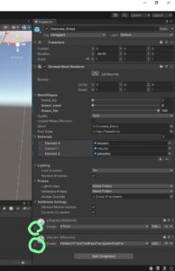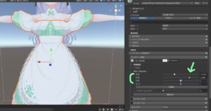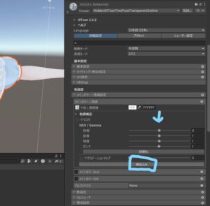 今回はマテリアルが2つあるので、2つとも同じようにバーをいじって、どのパーツか確認しながら色を調整します。色が決まったら、焼きこみ(下図の水色の部分)を押すと、自分が作った色のテクスチャが自動で生成されます。面倒な人は、この作業をしなくてもよいのですが、焼きこみをしないままだと相手のデバイスによっては色を変更する前の状態で見えることがあります。相手がパソコンだと、変更した色で反映されるのですが、スマホやパソコンにつないでいない状態VRゴーグルのみ(android勢や単機勢)だと、元のピンクの色で見えるみたいです。焼きこみが完了すると図のように、弄ったバーが一列に並んだ状態に戻ります。