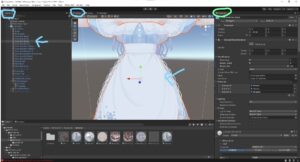この子を、水色にしていきます。まずは、色を変えたい部分をシーンかヒエラルキー(水色の部分)で選んでクリックし、詳細説明が右側のインスペクター(黄緑の部分)にでるようにします。