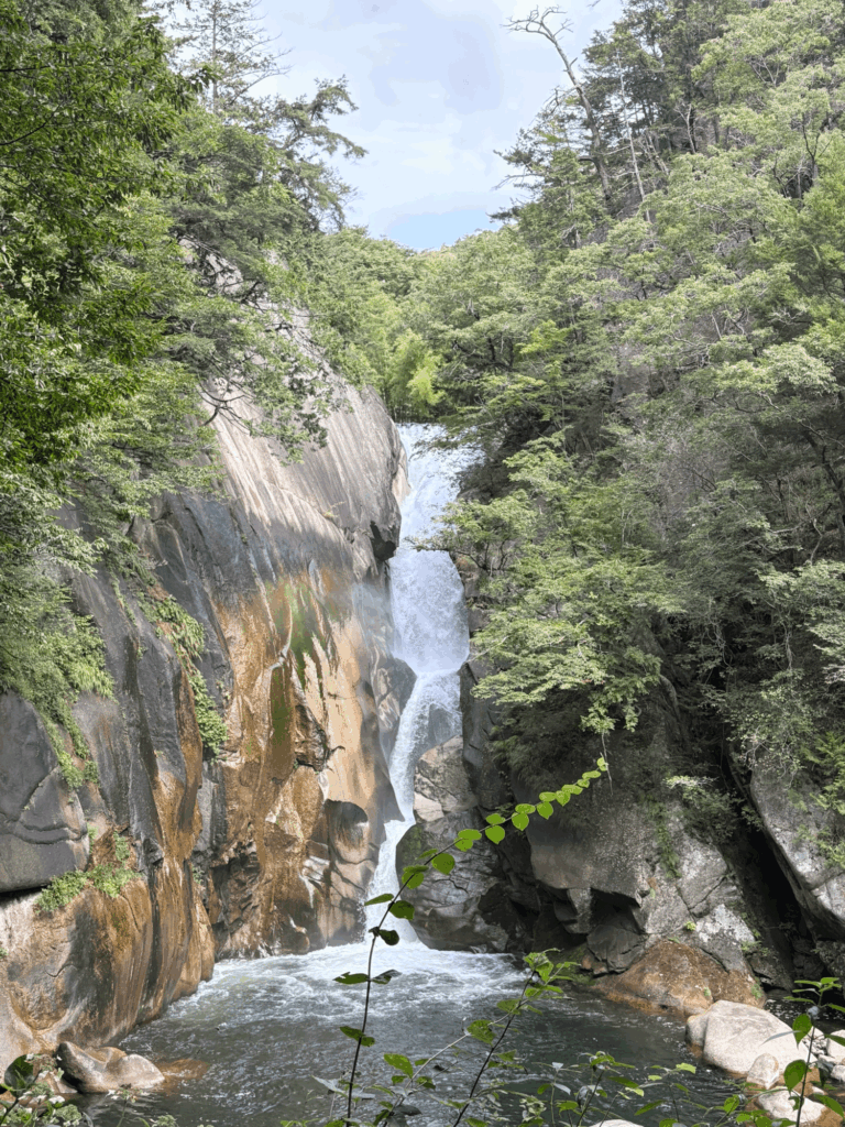 こちらは仙娥滝といい、先ほどの覚円峰のふもと部分にあります。 落差は30mほどあり、こちらも迫力がありました。9月末の山梨はまだ気温が高かったので、この辺りは特に涼しく感じられましたね。