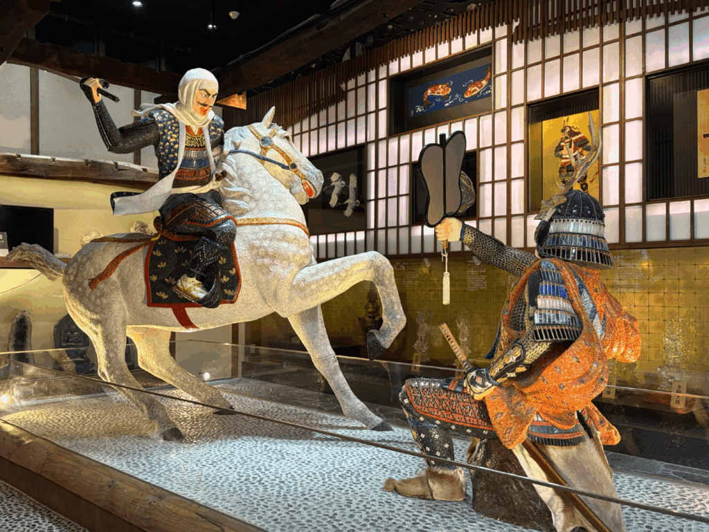 かの有名な川中島の戦い、上杉謙信と武田信玄の一騎打ちの場面を表した像。写真ではわかりにくいと思いますが…この像も、後ろに写る仏像たちも同様に、宝石等でつくられたものです。