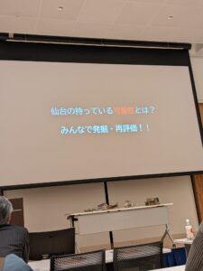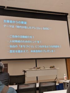 はえー、仙台の魅力ねぇ、と。若かりし頃ならそんなものはないと忌避していたが、老いてものの見方が変わると苦い思い出の多い土地でも愛着がわき、知りたいと思うらしく私は参加を決意した。